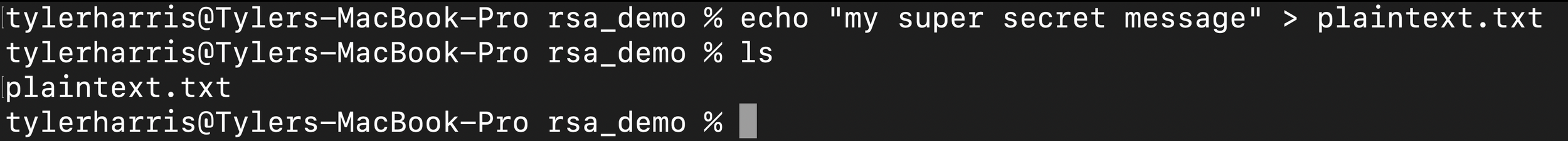The first thing we need to do is to great a blank directory for us to work in to make life easier. You can do this with your File Explorer/Finder or with the command line. It doesn’t really matter what it is called. I’ll call mine “rsa_demo” and use the following commands on Mac/Linux: